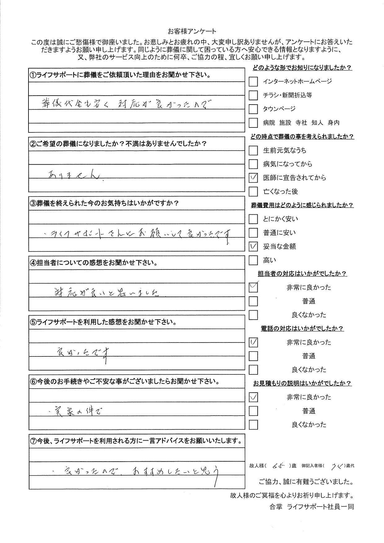 - 本当にとてもていねいな担当の方だったし、お値段的にも安く、それ以上によくしていただいたので、親族にも好評でした。ぜひ、これから葬儀会社を検討する方急な葬儀を必要とする方は候補の一つに考えていただいても良いと思います。お値段以上に手厚いサービスさせてもらってとても満足しています。ありがとうございました。
