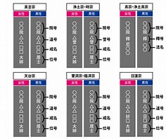 | 特徴 | 2文字の「戒名」の前に「道号」「居士・大姉」などの「位号」がつくのが一般的 | 「釋(しゃく)」の字が頭につき、その後に2文字の「法名」が続く。位号はつけない | 宗派や寺院によって形式は様々だが、戒名に近い使われ方をすることも多い |