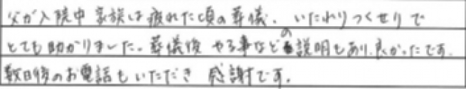 - 大変お世話になりました。説明もわかりやすく、何よりその人の人柄の良さ。そのおかげで穏やかな気持ちで父を見届けることができました。