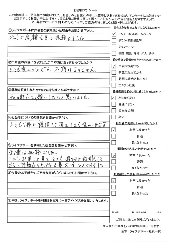 - 丁寧であることと、控え目で遺族の方の心に沿って、対応して下さることをお伝えしたいと思います。