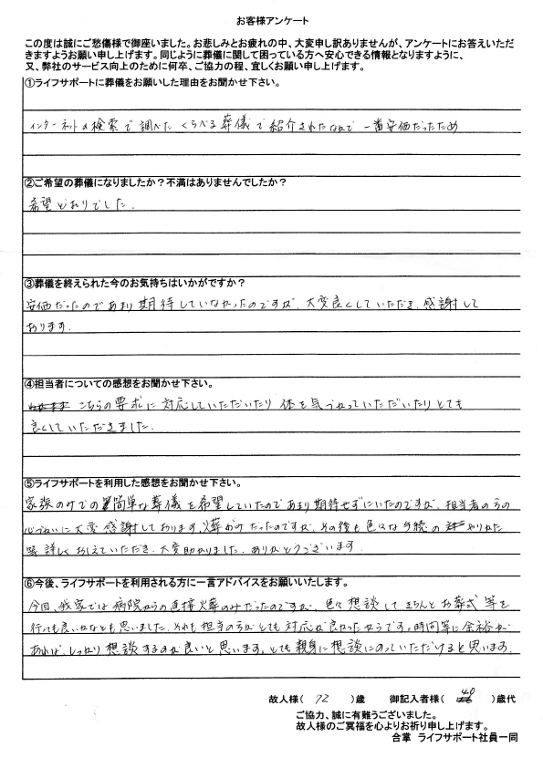 - 故人の希望により、火葬式のみの葬儀をして頂ける葬儀屋さんを探してはいましたが、病院に聞いても斡旋になるので紹介して頂けず、インターネットを使ってお調べした所、分かりやすく内容が書かれていたので、お問い合わせさせて頂き、とてもわかりやすいご案内だったので、ライフサポートさんでお願いしたいと思いました。
